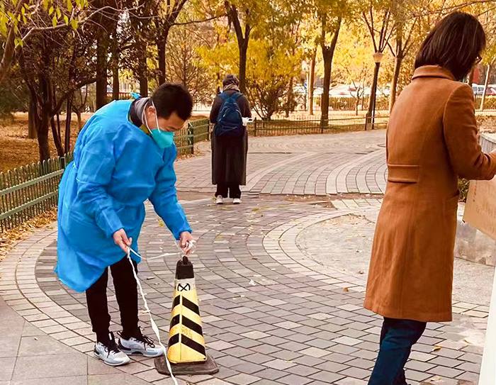 安定园区公司职工孙颜刚在广百西路社区核酸检测点摆放安全隔离线