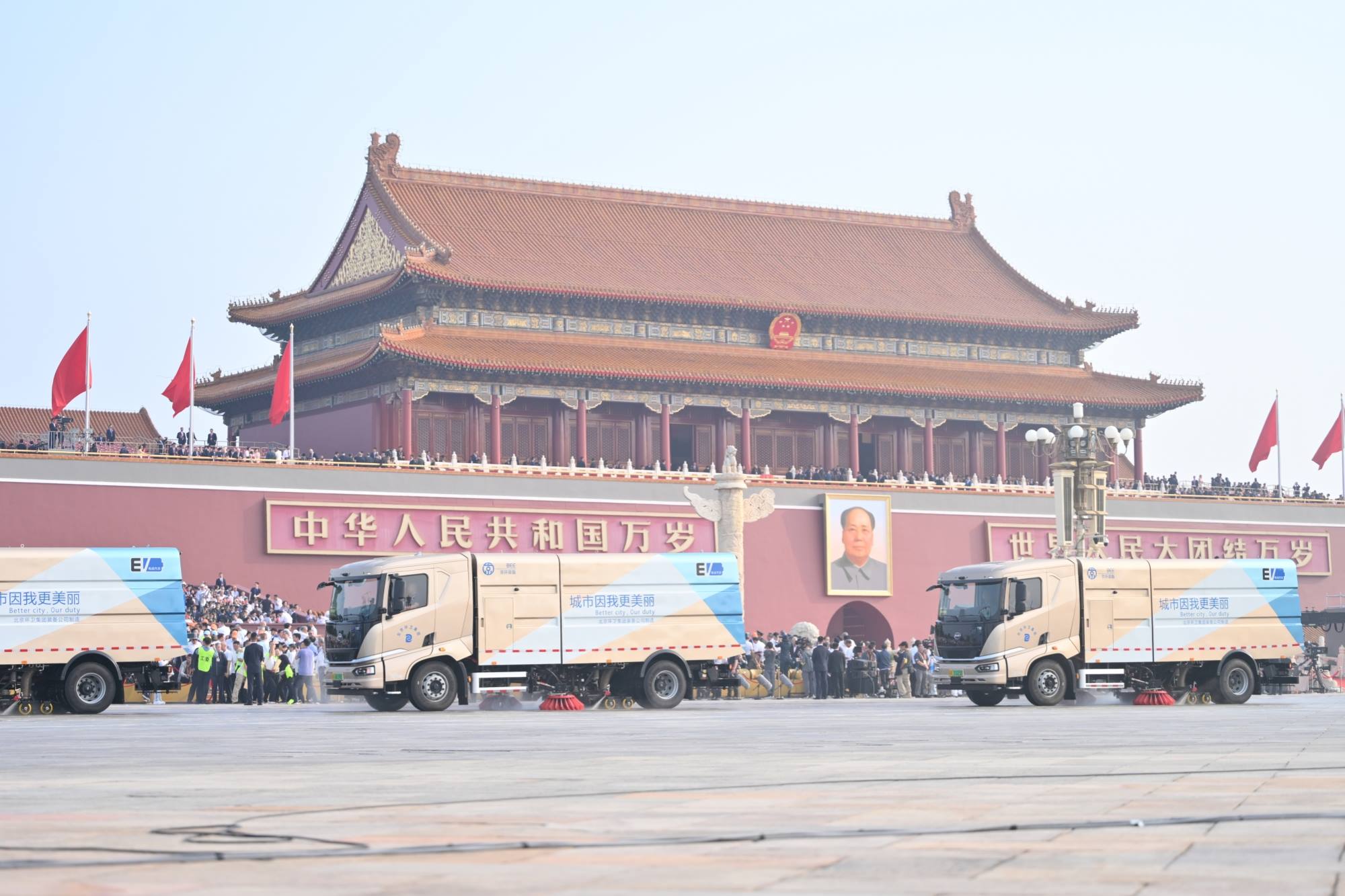 在阅兵正式开始前,北Ebpay卫集团研发制造的23辆新一代洗扫车登上长安街,整齐编队作业。